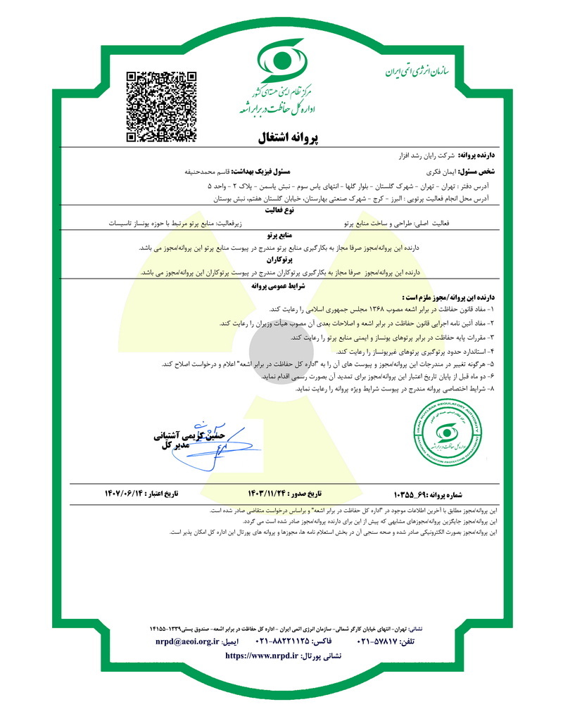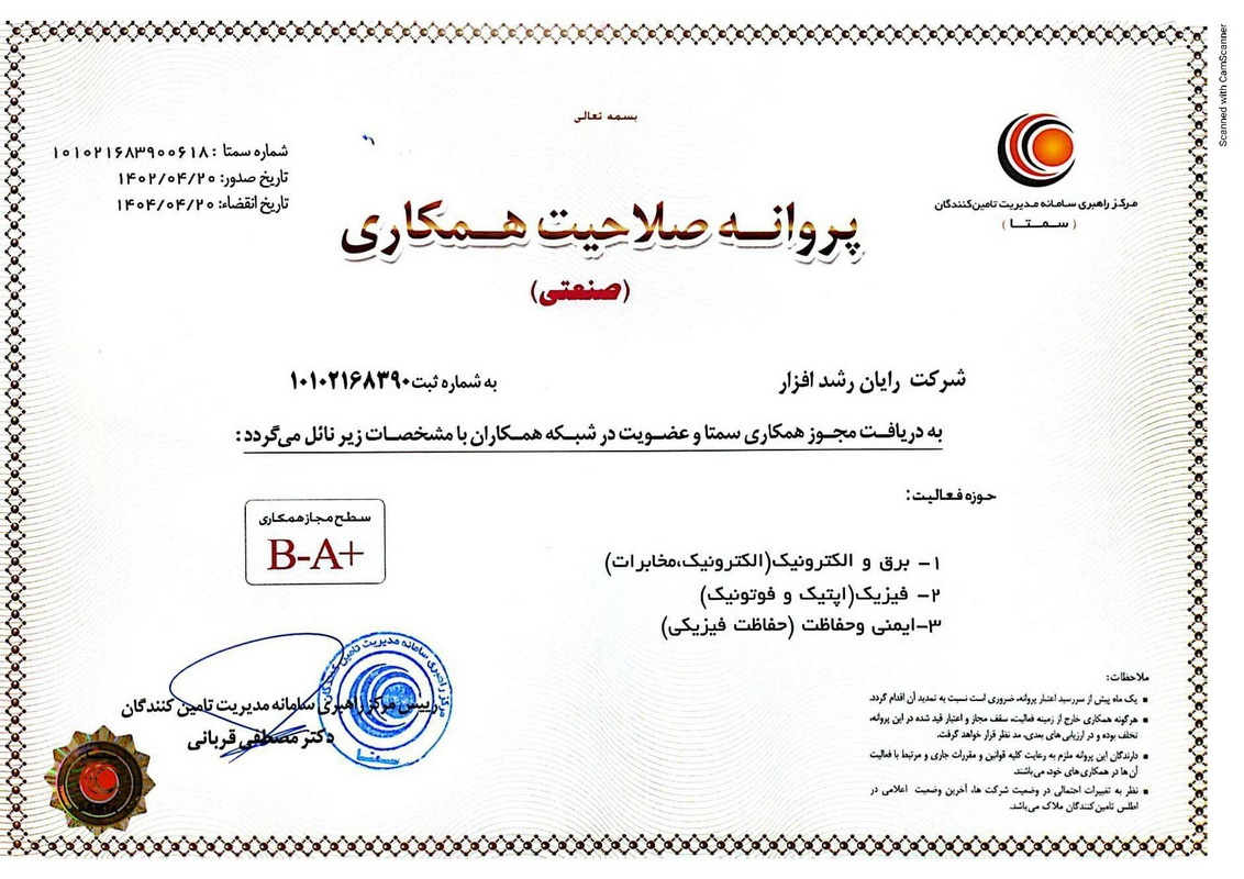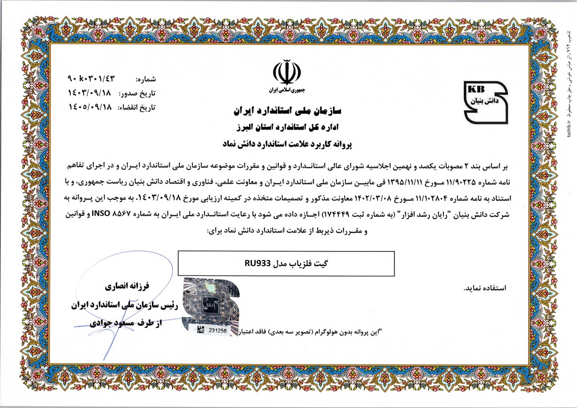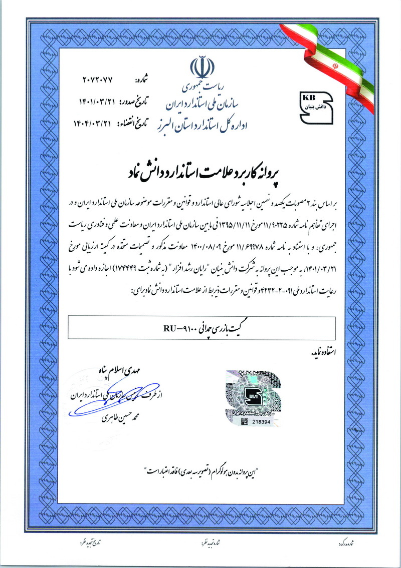 به شرکت دانش بنیان رایان رشد افزار اجازه داده می شود با رعایت استاندارد ملی4232-2-091 و قوانین و مقررات ذیربط از علامت استاندارد دانش نماد برای